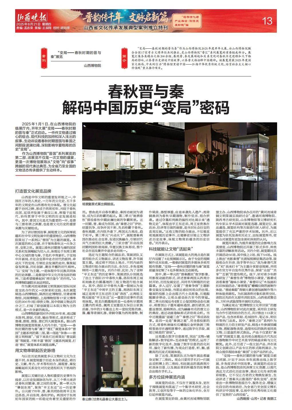 “变局——春秋时期的晋与秦”展览目前已闭展,计划于2025年年底推出线上数字展,多角度讲述中国故事。该展览的成功实践,是山西博物院依托深厚文化资源,以现代表达方式活化历史叙事、推动文化传承的精彩缩影。它不仅让古老的文物焕发新生,生动讲述了晋秦风云激荡的“春秋变局”,更探索出一条博物馆连接古今、服务社会、增强文化自信的有效路径,为全省乃至全国文博机构讲好中国故事、弘扬中华优秀传统文化提供了宝贵的“山西经验”。