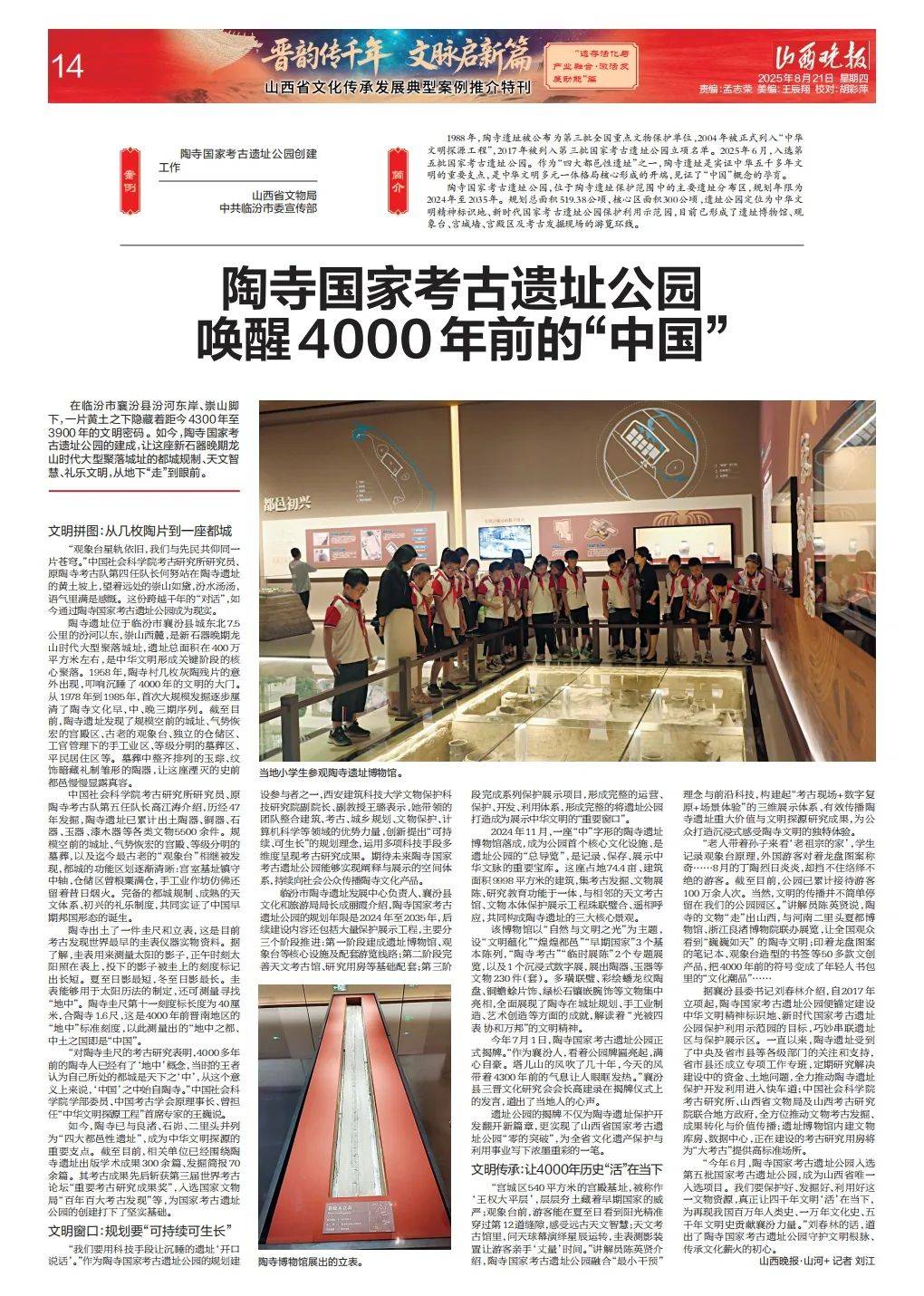 “今年6月,陶寺国家考古遗址公园入选第五批国家考古遗址公园,成为山西省唯一入选项目。我们要保护好、发掘好、利用好这一文物资源,真正让四千年文明‘活’在当下,为再现我国百万年人类史、一万年文化史、五千年文明史贡献襄汾力量。”刘春林的话,道出了陶寺国家考古遗址公园守护文明根脉、传承文化薪火的初心。