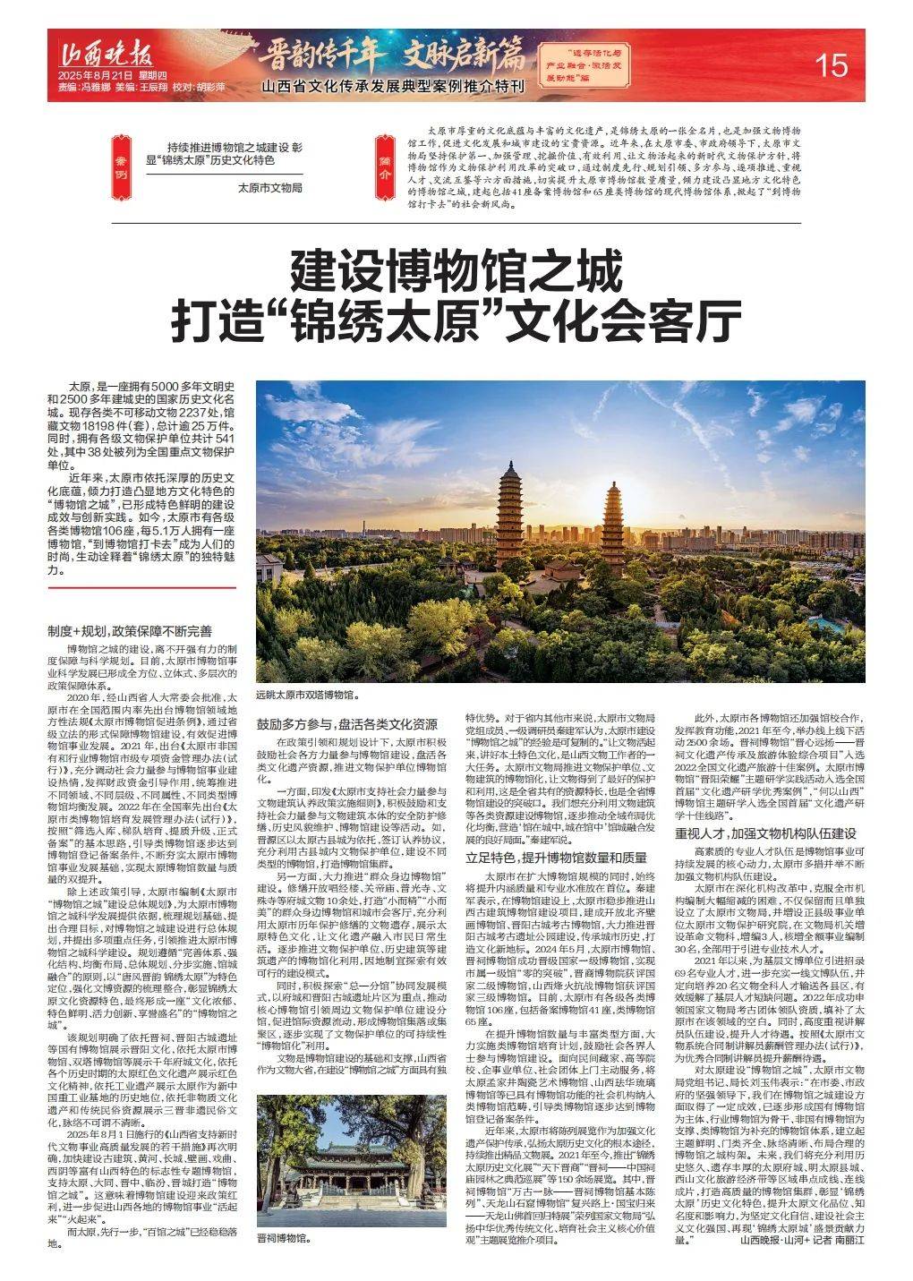 近年来,太原市依托深厚的历史文化底蕴,倾力打造凸显地方文化特色的“博物馆之城”,已形成特色鲜明的建设成效与创新实践。如今,太原市有各级各类博物馆106座,每5.1万人拥有一座博物馆,“到博物馆打卡去”成为人们的时尚,生动诠释着“锦绣太原”的独特魅力。