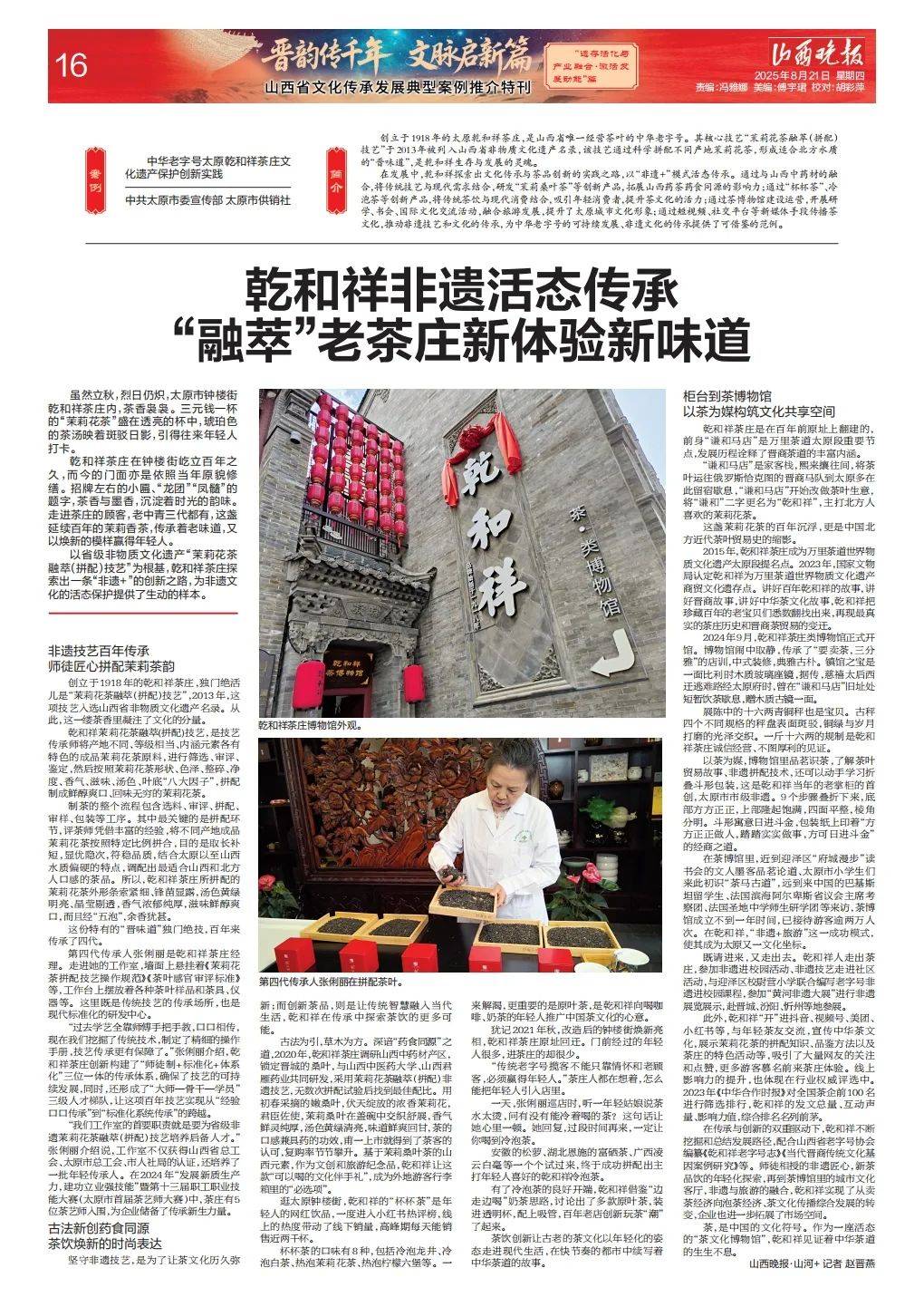 在传承与创新的双重驱动下,乾和祥不断挖掘和总结发展路径,配合山西省老字号协会编纂《乾和祥老字号志》《当代晋商传统文化基因案例研究》等。师徒相授的非遗匠心,新茶品饮的年轻化探索,再到茶博馆里的城市文化客厅,非遗与旅游的融合,乾和祥实现了从卖茶经济向泡茶经济、茶文化传播综合发展的转变,企业也进一步拓展了市场空间。